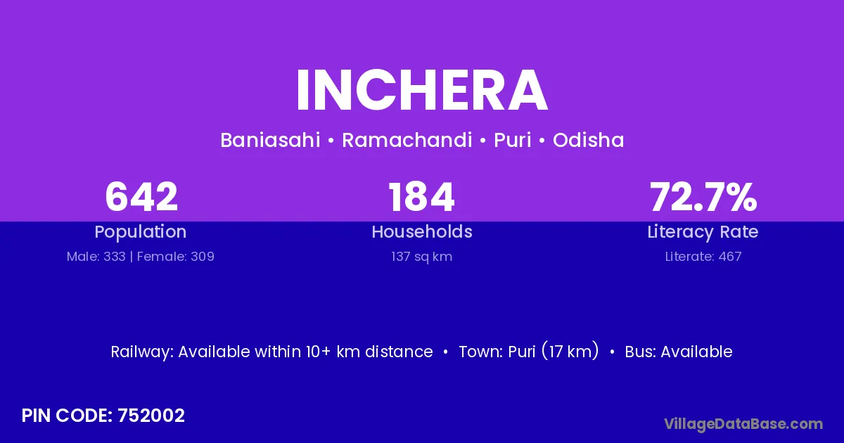 Puri (17 km) is the nearest town to Inchera village for major economic activities and is located approximately 17 km away.
