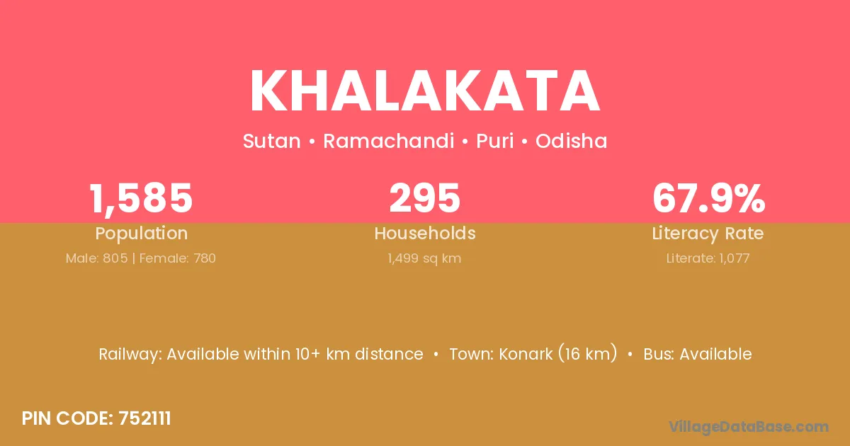 Konark (16 km) is the nearest town to Khalakata village for major economic activities and is located approximately 16 km away.