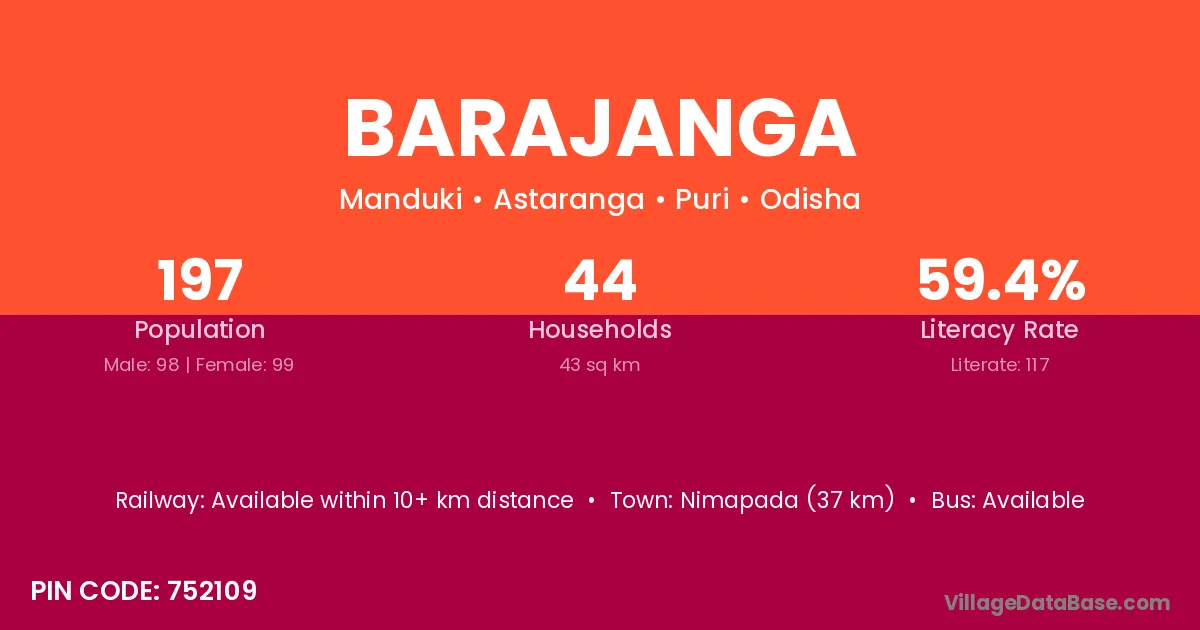 Puri (20 km) is the nearest town to Barajanga village for major economic activities and is located approximately 20 km away.