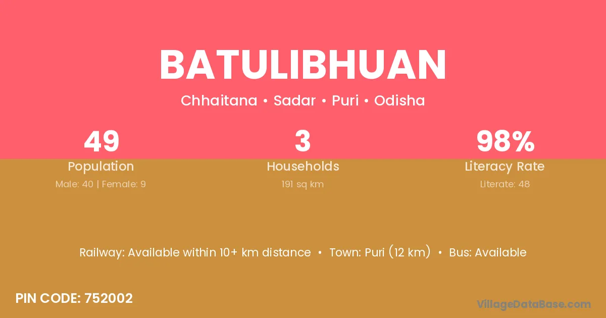 Puri (12 km) is the nearest town to Batulibhuan village for major economic activities and is located approximately 12 km away.