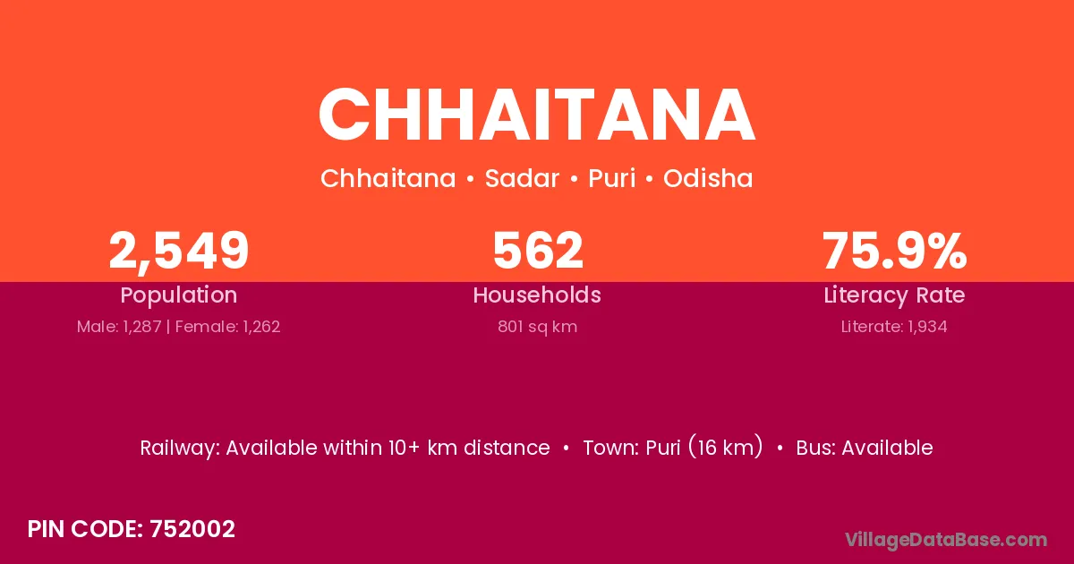 Puri (16 km) is the nearest town to Chhaitana village for major economic activities and is located approximately 16 km away.