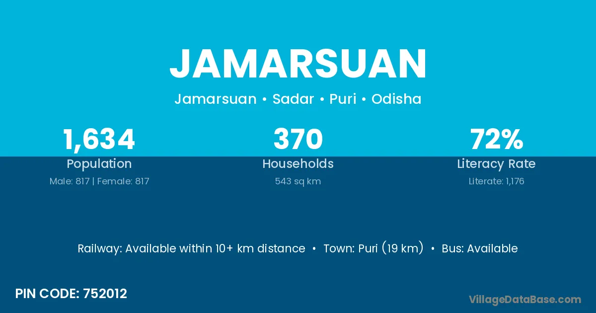 Puri (19 km) is the nearest town to Jamarsuan village for major economic activities and is located approximately 19 km away.