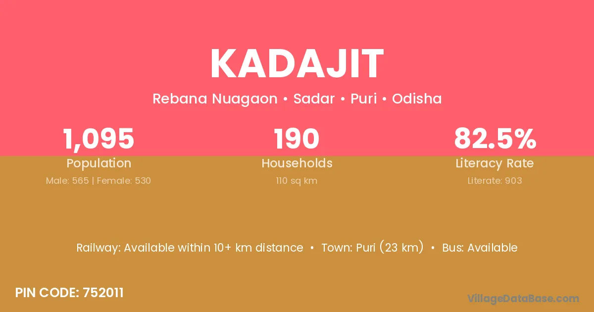 Puri (23 km) is the nearest town to Kadajit village for major economic activities and is located approximately 23 km away.