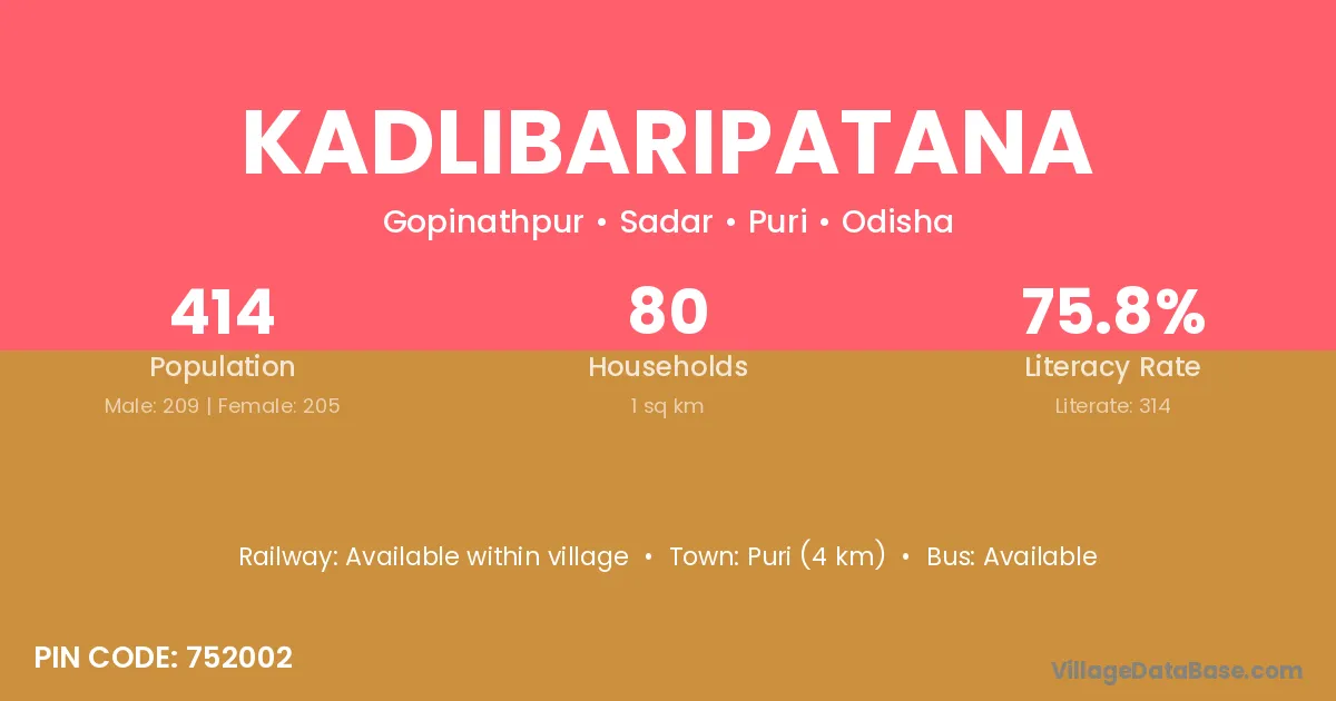 Puri (4 km) is the nearest town to Kadlibaripatana village for major economic activities and is located approximately 4 km away.