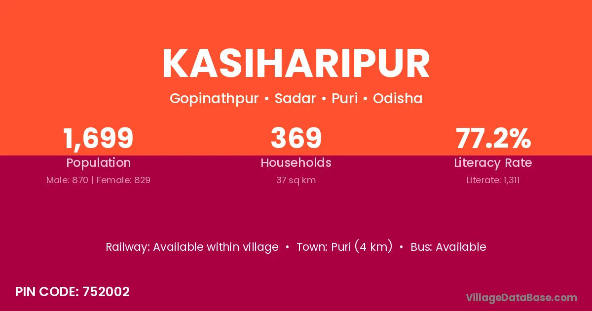 Puri (4 km) is the nearest town to Kasiharipur village for major economic activities and is located approximately 4 km away.