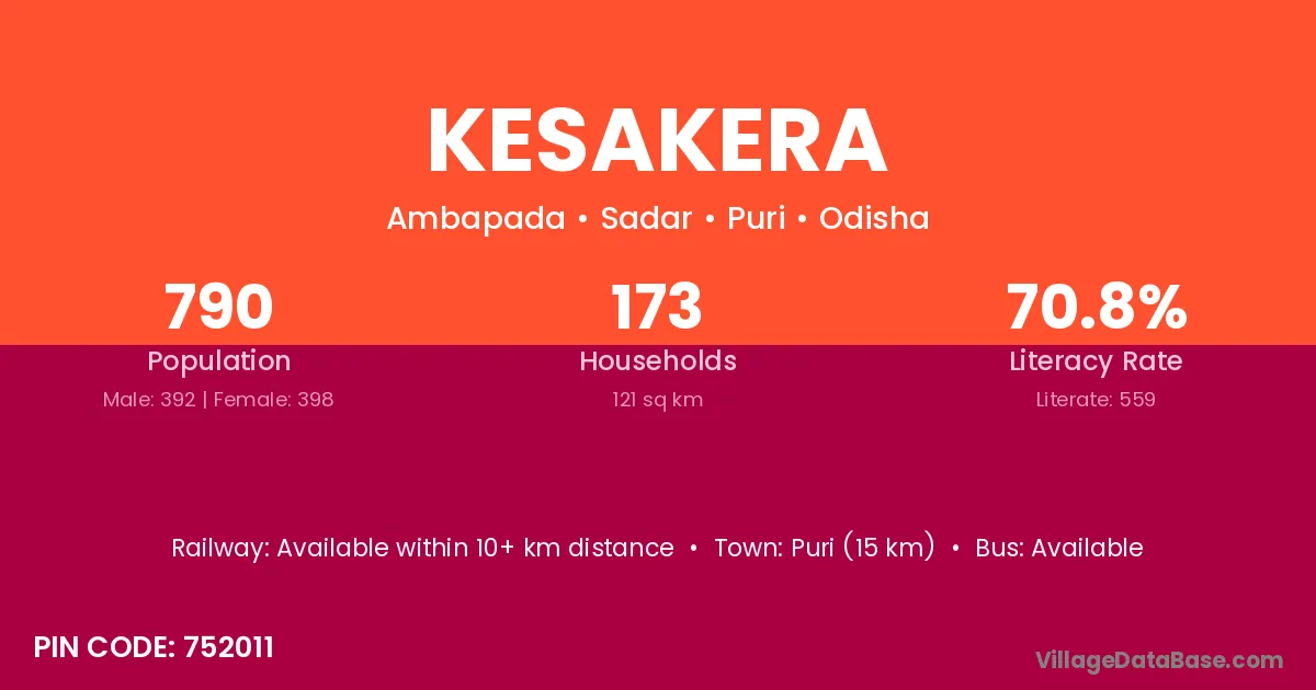 Puri (15 km) is the nearest town to Kesakera village for major economic activities and is located approximately 15 km away.