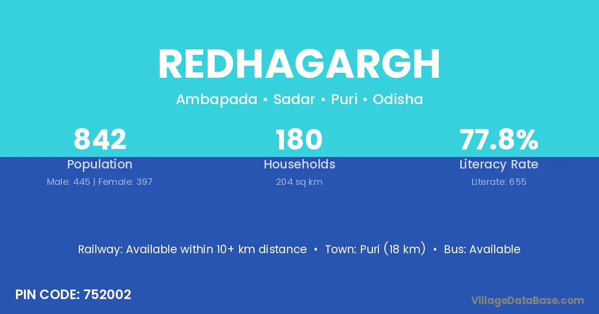 Puri (18 km) is the nearest town to Redhagargh village for major economic activities and is located approximately 18 km away.