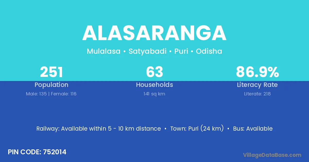Puri (24 km) is the nearest town to Alasaranga village for major economic activities and is located approximately 24 km away.