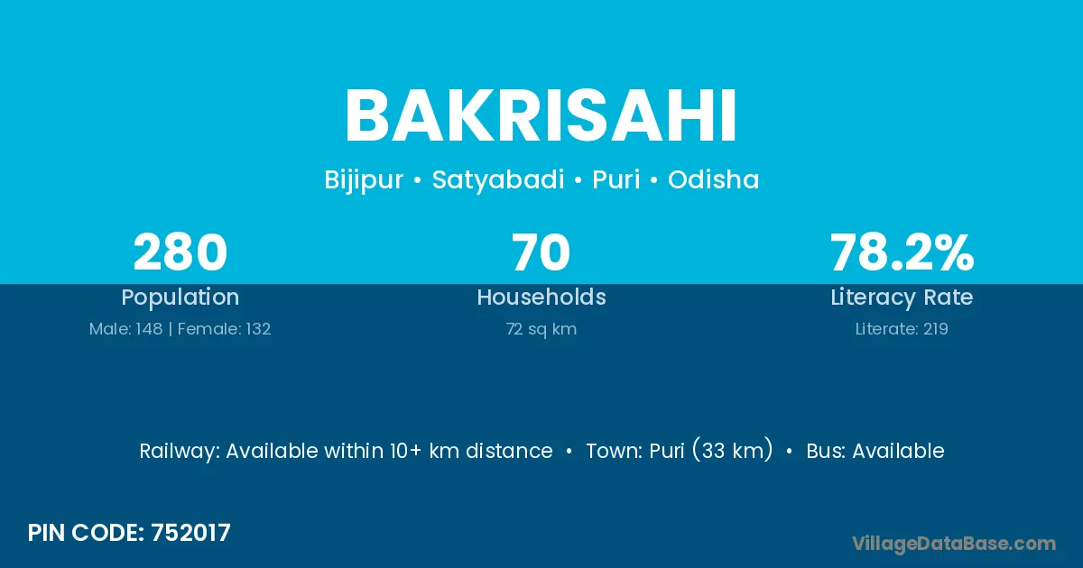 Puri (33 km) is the nearest town to Bakrisahi village for major economic activities and is located approximately 33 km away.