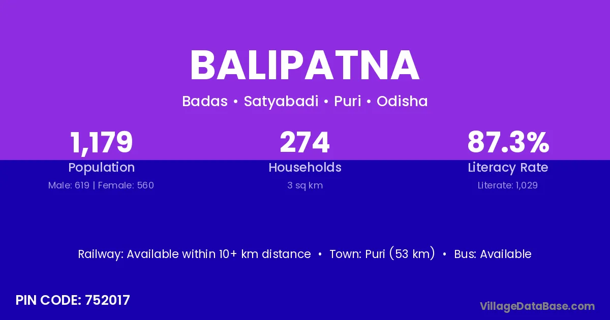 Puri (53 km) is the nearest town to Balipatna village for major economic activities and is located approximately 53 km away.