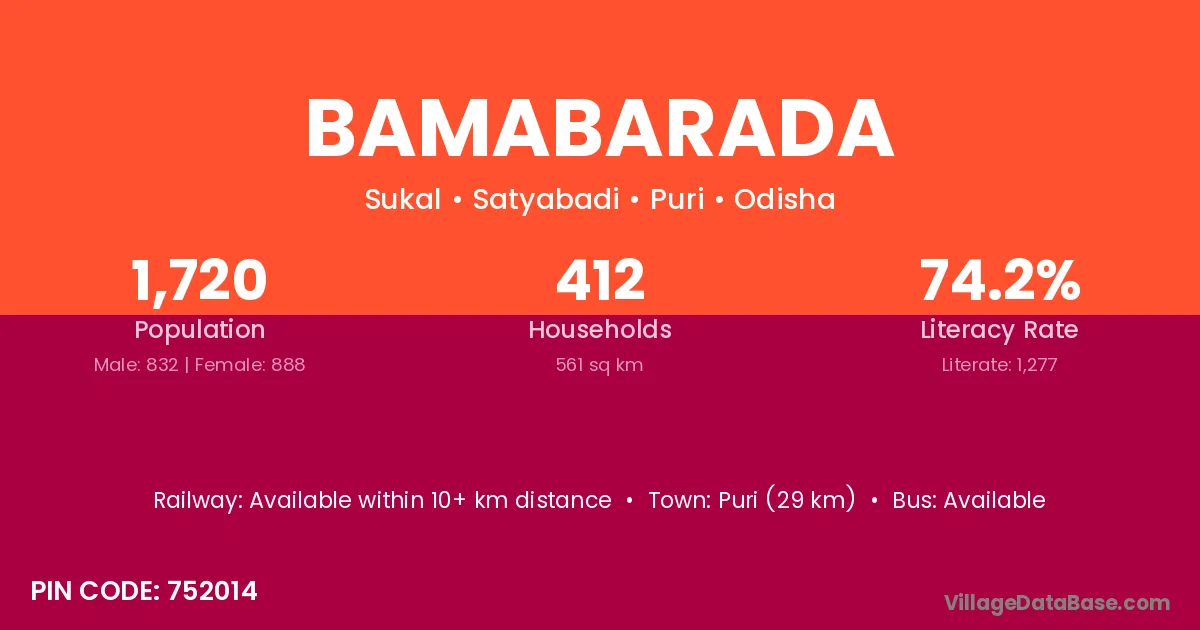 Puri (29 km) is the nearest town to Bamabarada village for major economic activities and is located approximately 29 km away.