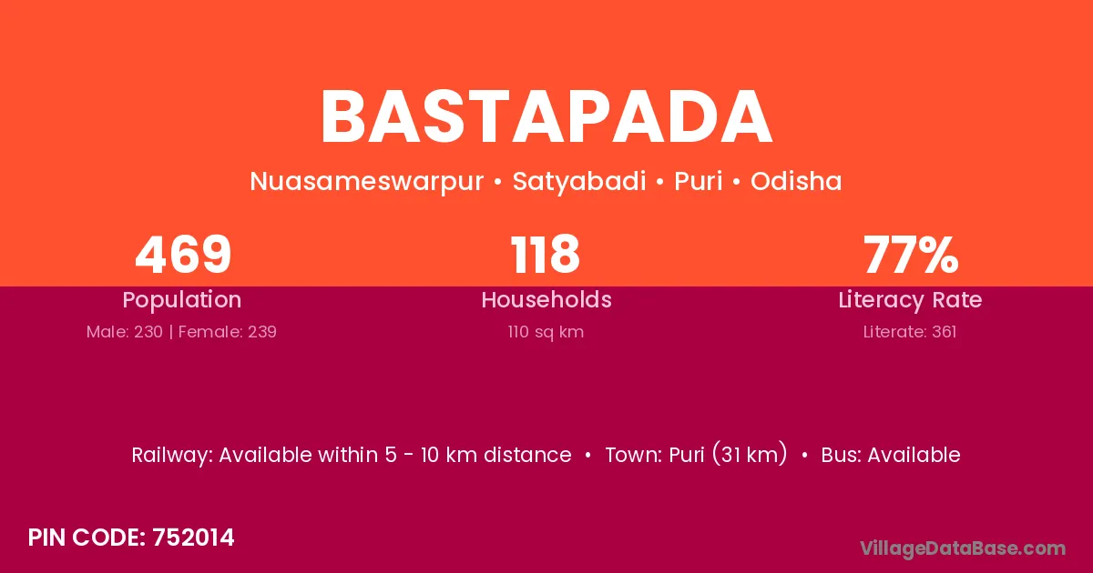Puri (31 km) is the nearest town to Bastapada village for major economic activities and is located approximately 31 km away.