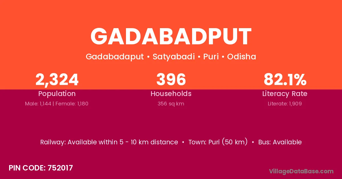 Puri (50 km) is the nearest town to Gadabadput village for major economic activities and is located approximately 50 km away.