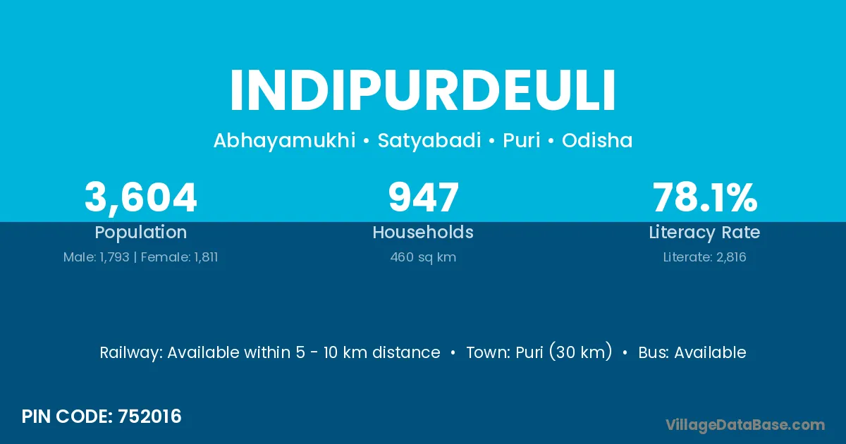 Puri (30 km) is the nearest town to Indipurdeuli village for major economic activities and is located approximately 30 km away.