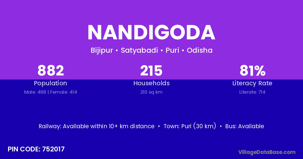 Puri (30 km) is the nearest town to Nandigoda village for major economic activities and is located approximately 30 km away.