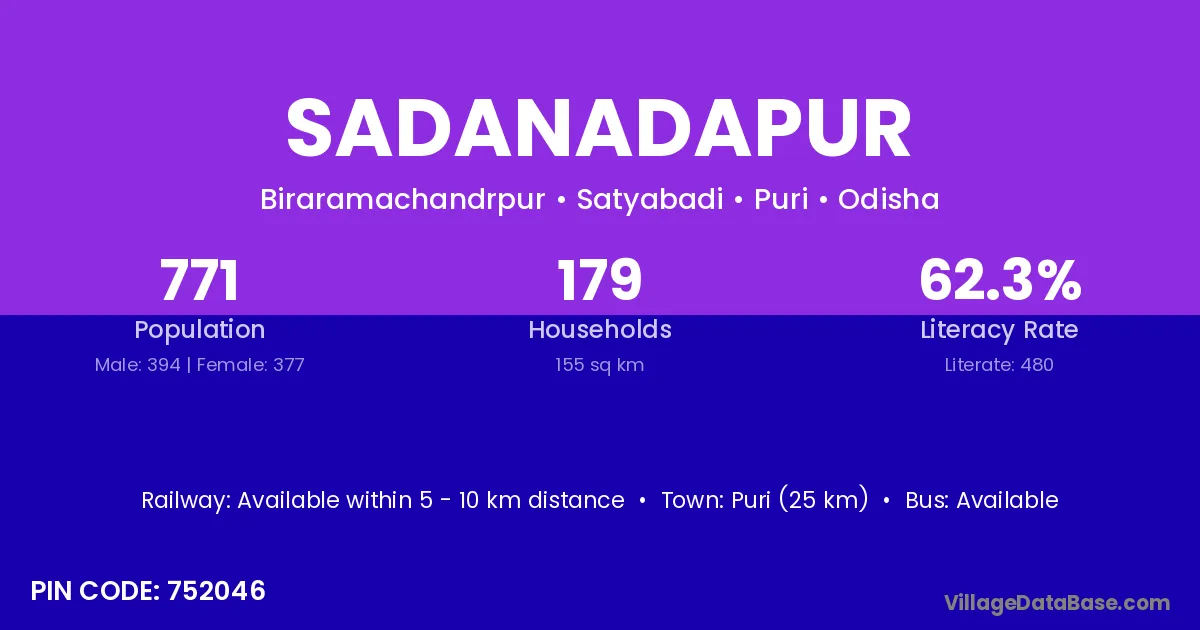 Puri (25 km) is the nearest town to Sadanadapur village for major economic activities and is located approximately 25 km away.