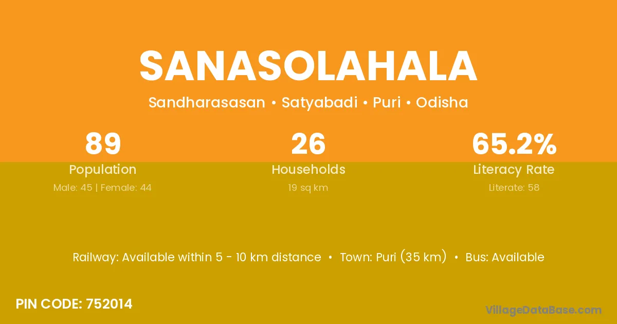 Puri (35 km) is the nearest town to Sanasolahala village for major economic activities and is located approximately 35 km away.