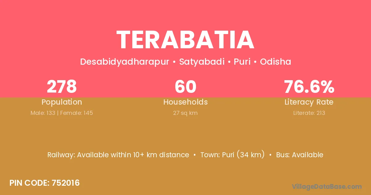 Puri (34 km) is the nearest town to Terabatia village for major economic activities and is located approximately 34 km away.