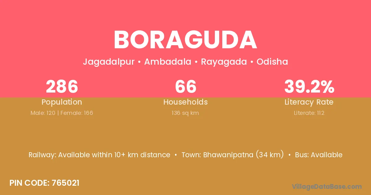 Bhawanipatna (34 km) is the nearest town to Boraguda village for major economic activities and is located approximately 34 km away.
