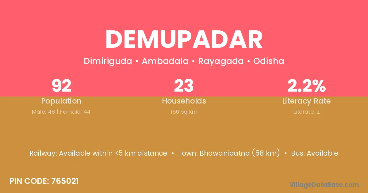 Bhawanipatna (58 km) is the nearest town to Demupadar village for major economic activities and is located approximately 58 km away.