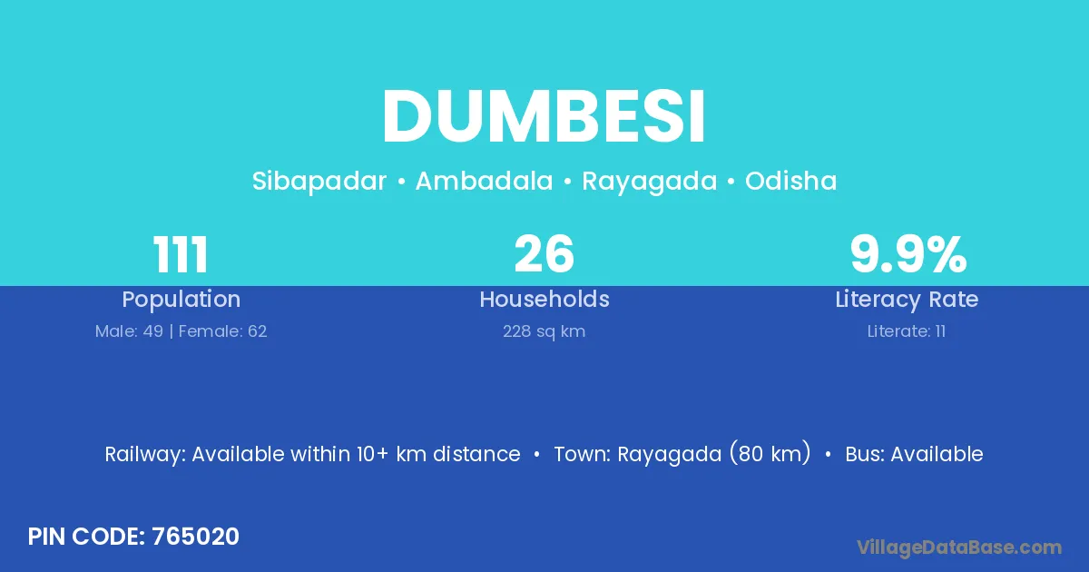 Rayagada (80 km) is the nearest town to Dumbesi village for major economic activities and is located approximately 80 km away.