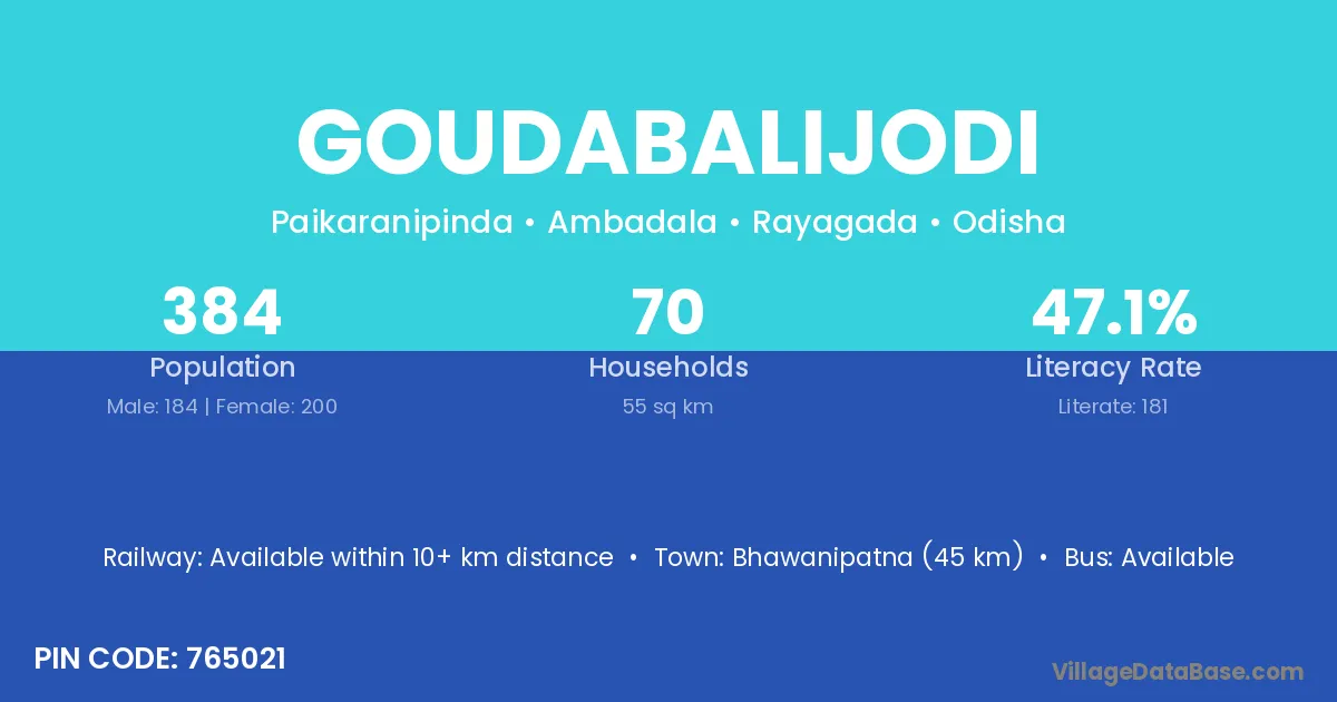 Bhawanipatna (45 km) is the nearest town to Goudabalijodi village for major economic activities and is located approximately 45 km away.