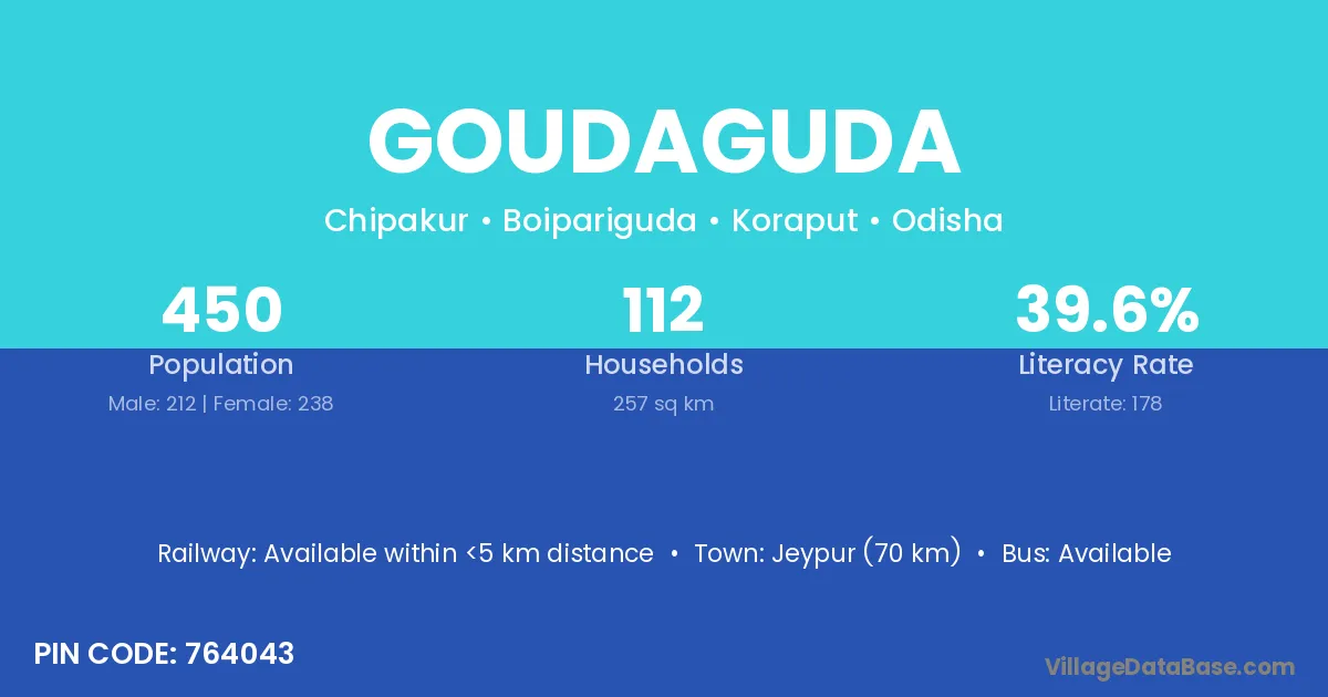 Rayagada (79 km) is the nearest town to Goudaguda village for major economic activities and is located approximately 79 km away.