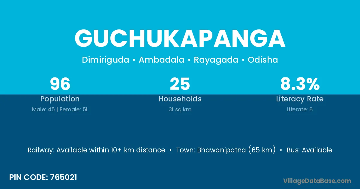 Bhawanipatna (65 km) is the nearest town to Guchukapanga village for major economic activities and is located approximately 65 km away.