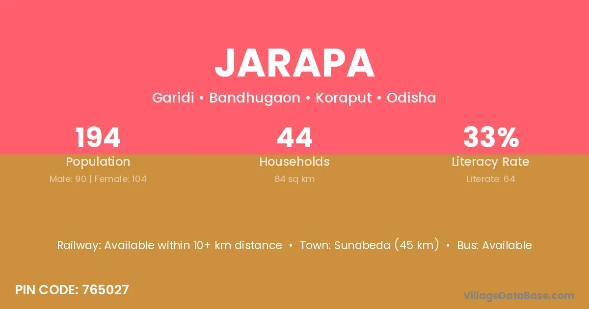 Bhawanipatna (64 km) is the nearest town to Jarapa village for major economic activities and is located approximately 64 km away.