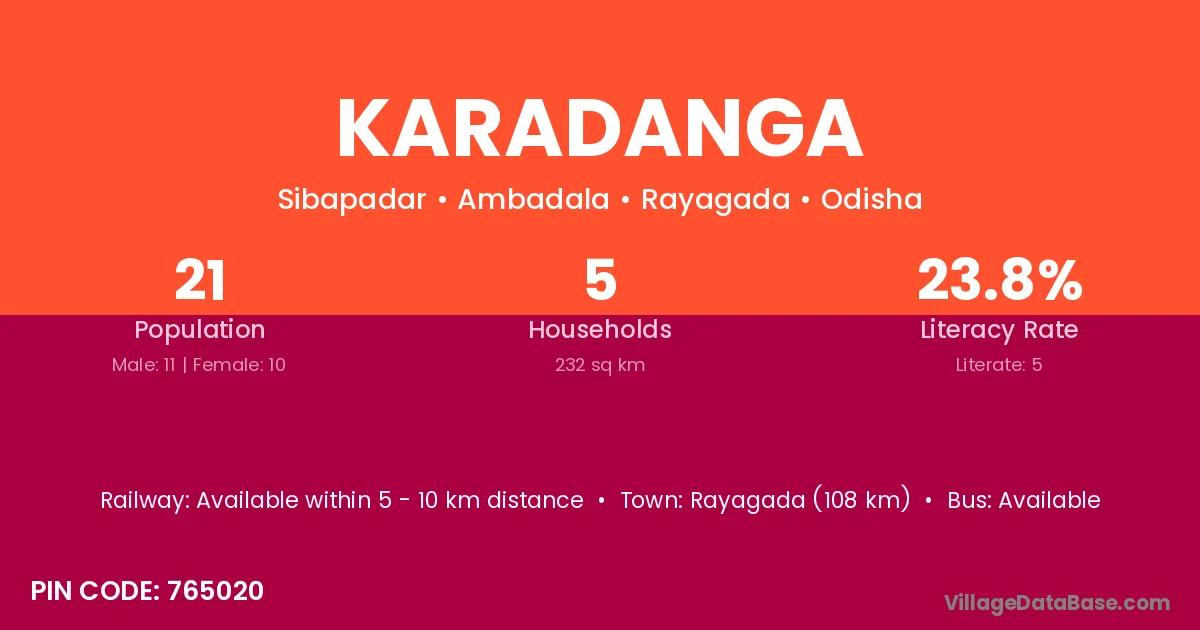 Karadanga village has a total population of 21 people, of which 11 are males and 10 are females.