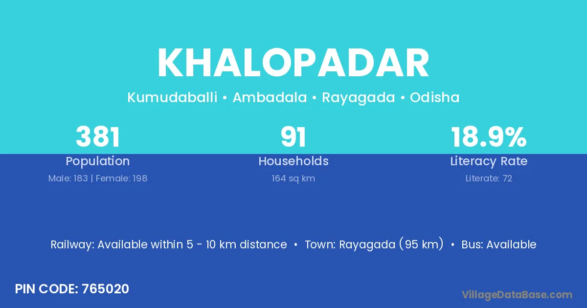 Rayagada (95 km) is the nearest town to Khalopadar village for major economic activities and is located approximately 95 km away.