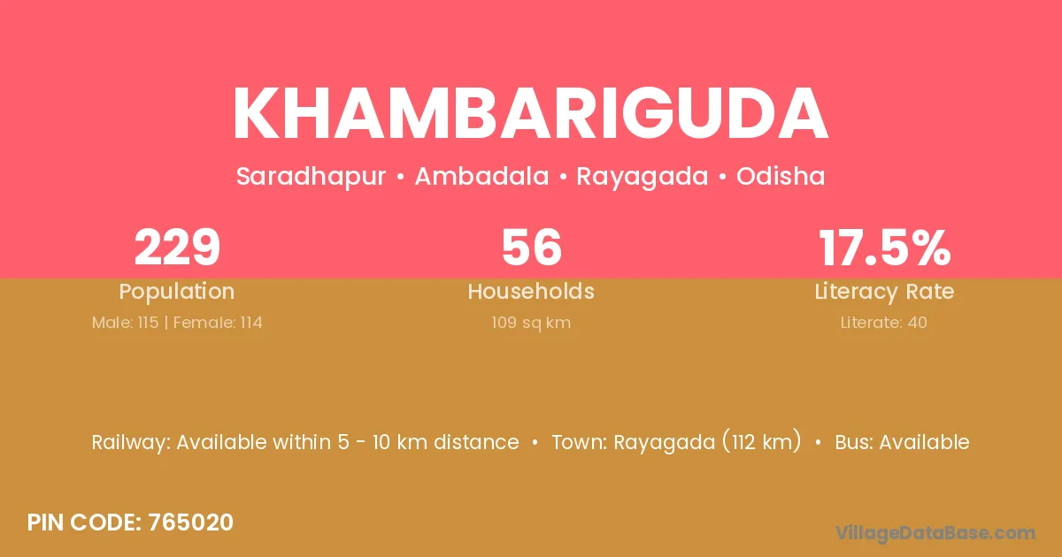 Khambariguda village has a total population of 229 people, of which 115 are males and 114 are females.