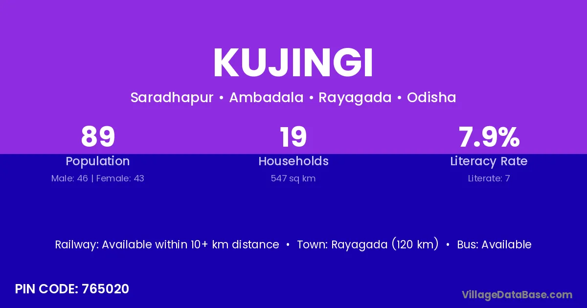 Rayagada (120 km) is the nearest town to Kujingi village for major economic activities and is located approximately 120 km away.
