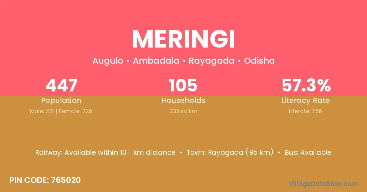 Rayagada (95 km) is the nearest town to Meringi village for major economic activities and is located approximately 95 km away.