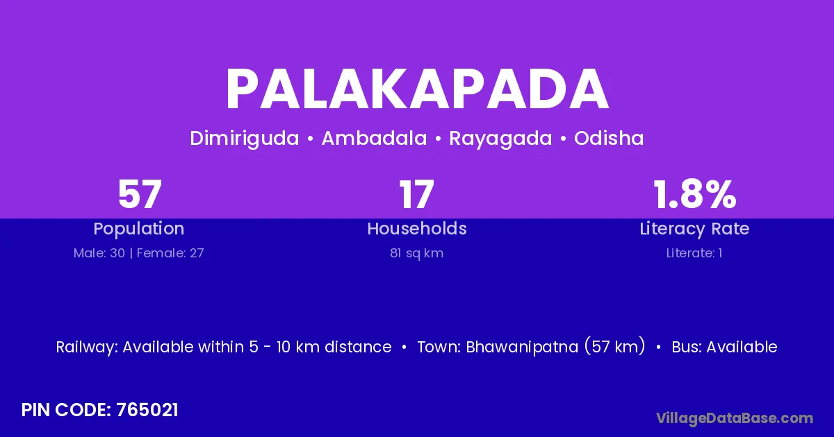 Bhawanipatna (57 km) is the nearest town to Palakapada village for major economic activities and is located approximately 57 km away.
