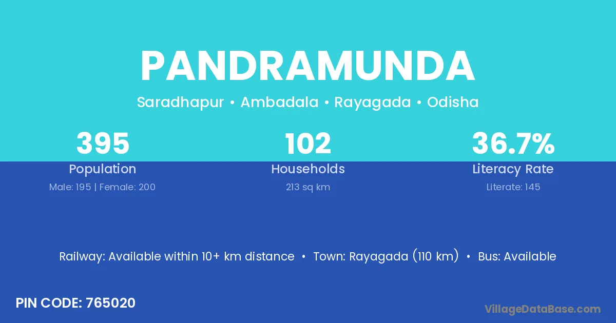 Rayagada (110 km) is the nearest town to Pandramunda village for major economic activities and is located approximately 110 km away.