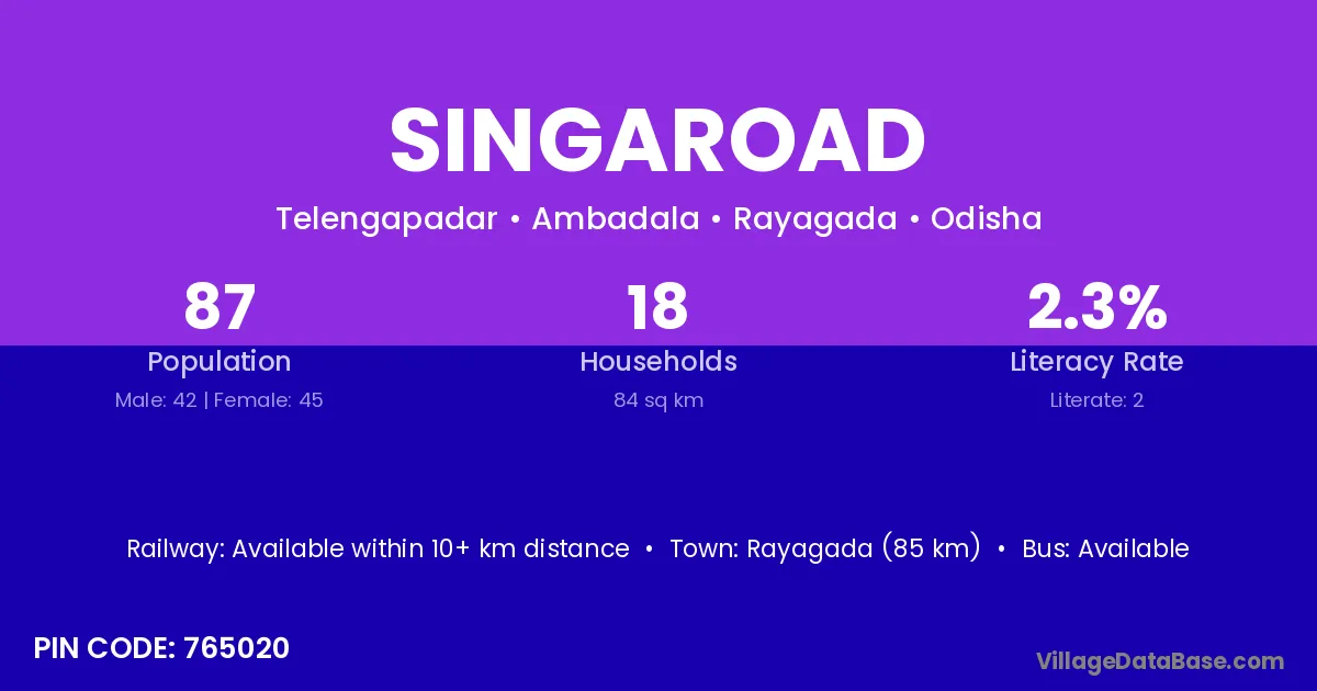 Rayagada (85 km) is the nearest town to Singaroad village for major economic activities and is located approximately 85 km away.
