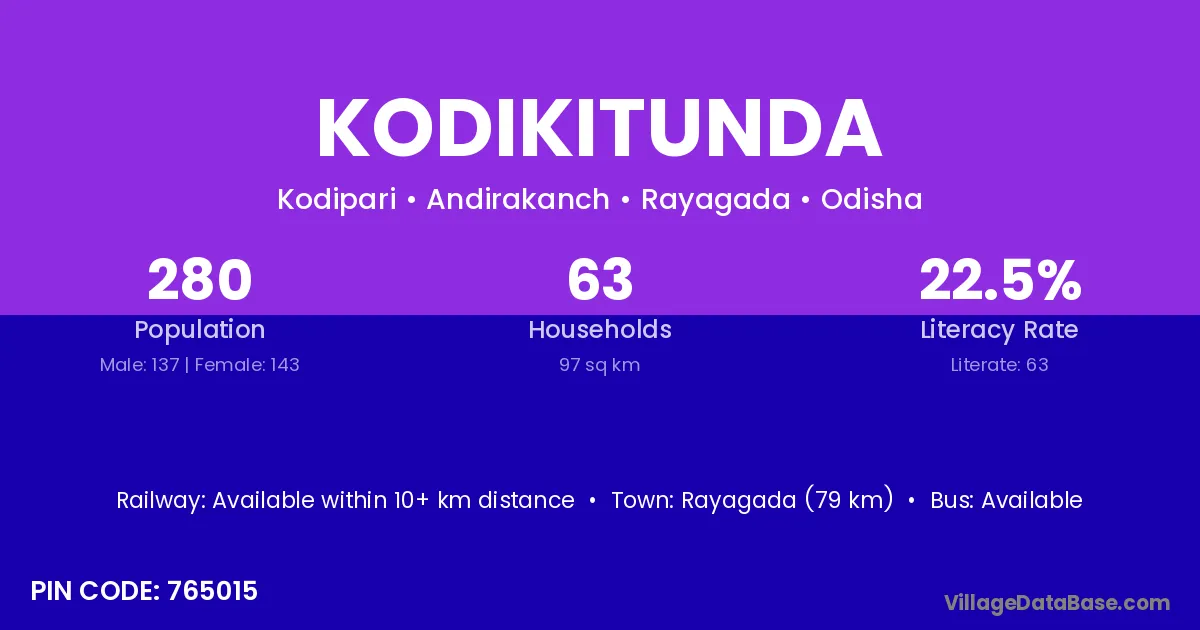 Rayagada (79 km) is the nearest town to Kodikitunda village for major economic activities and is located approximately 79 km away.