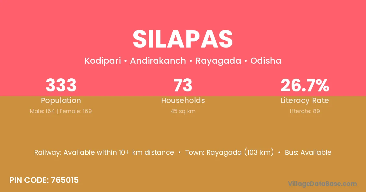 Rayagada (103 km) is the nearest town to Silapas village for major economic activities and is located approximately 103 km away.