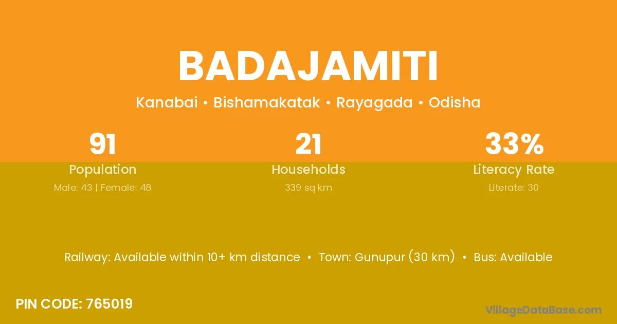 Gunupur (30 km) is the nearest town to Badajamiti village for major economic activities and is located approximately 30 km away.