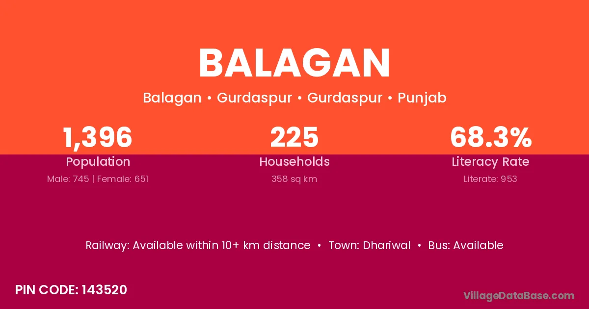 The literacy rate of Balagan village is 56.29%. Male literacy stands at 58.44% and female literacy at 54.44%.