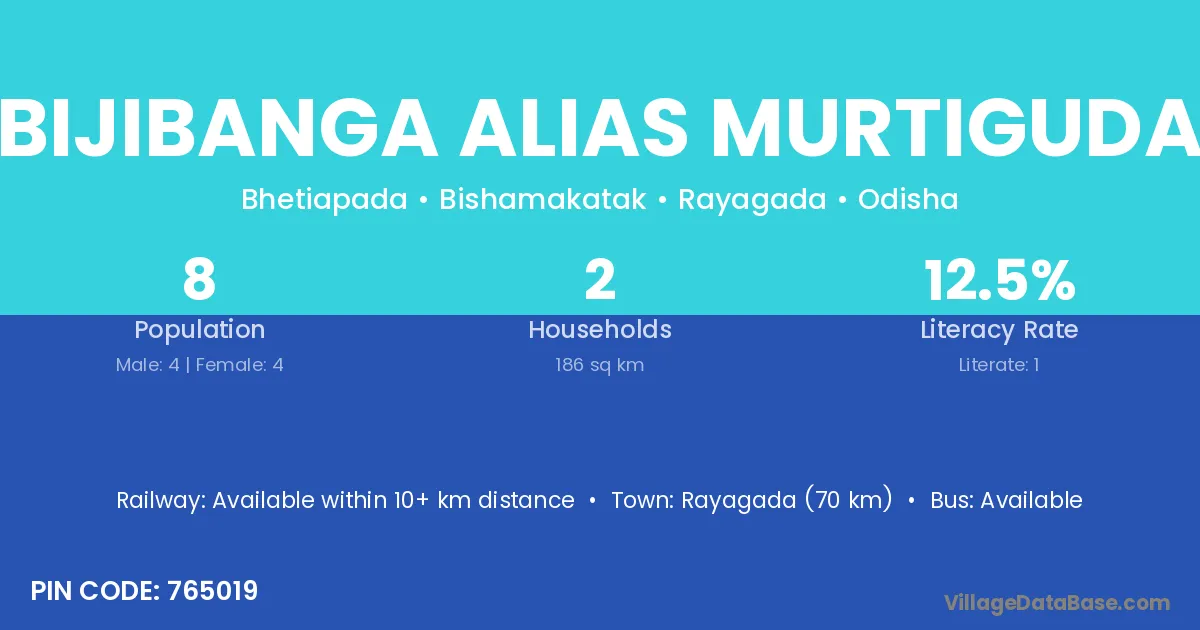 Rayagada (70 km) is the nearest town to Bijibanga Alias Murtiguda village for major economic activities and is located approximately 70 km away.