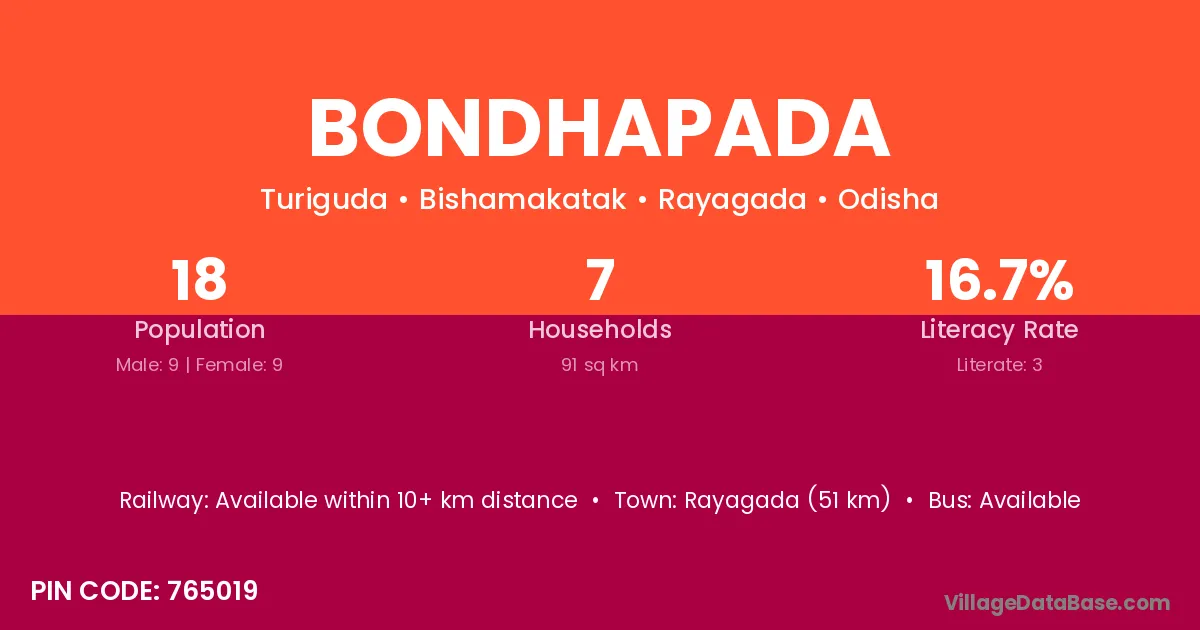 Rayagada (51 km) is the nearest town to Bondhapada village for major economic activities and is located approximately 51 km away.