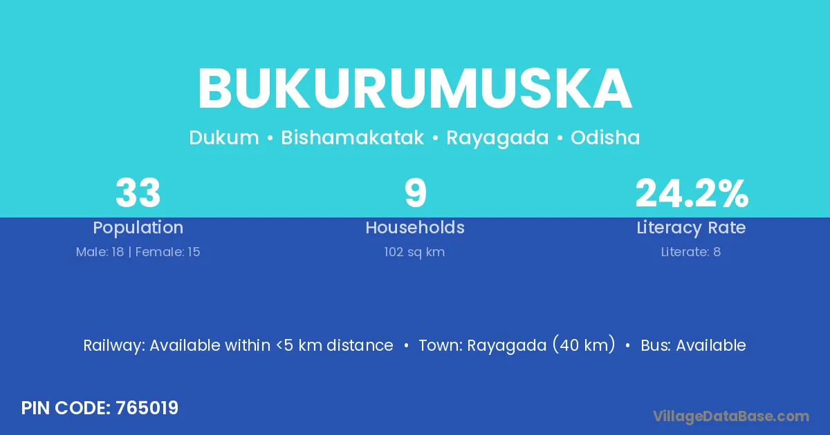 Rayagada (40 km) is the nearest town to Bukurumuska village for major economic activities and is located approximately 40 km away.