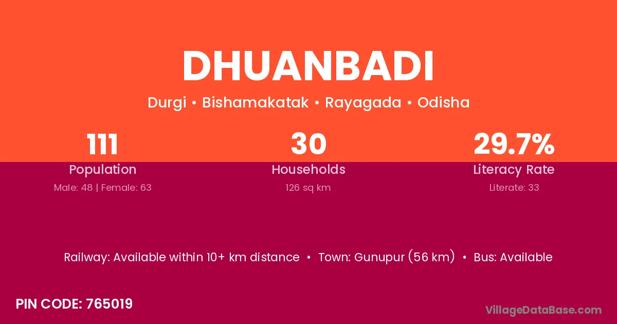 Dhuanbadi village has a total population of 111 people, of which 48 are males and 63 are females.