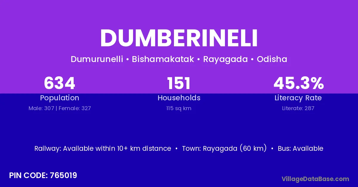 Rayagada (60 km) is the nearest town to Dumberineli village for major economic activities and is located approximately 60 km away.