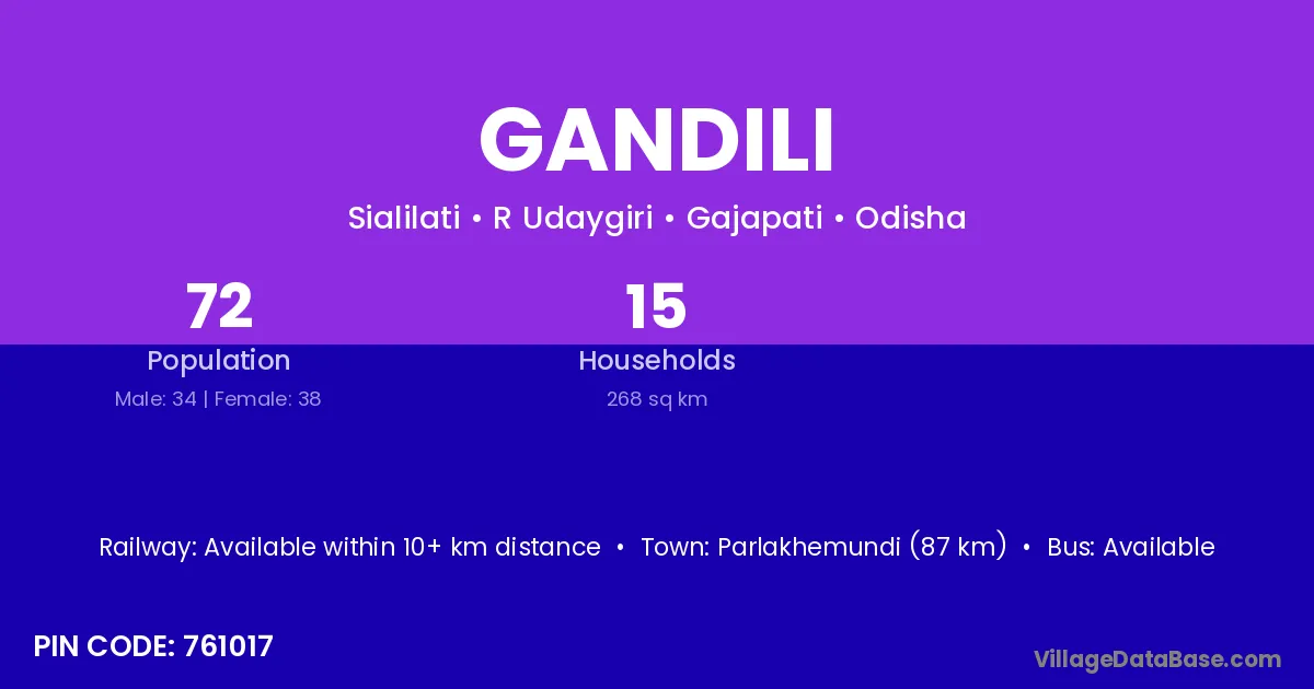 Rayagada (53 km) is the nearest town to Gandili village for major economic activities and is located approximately 53 km away.
