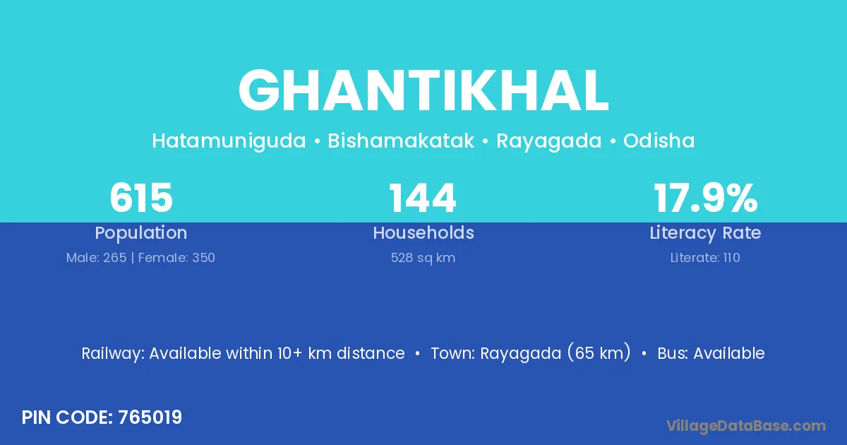 Rayagada (65 km) is the nearest town to Ghantikhal village for major economic activities and is located approximately 65 km away.