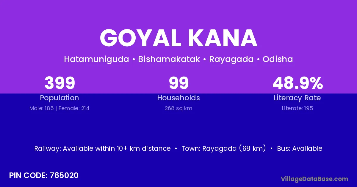 Rayagada (68 km) is the nearest town to Goyal Kana village for major economic activities and is located approximately 68 km away.