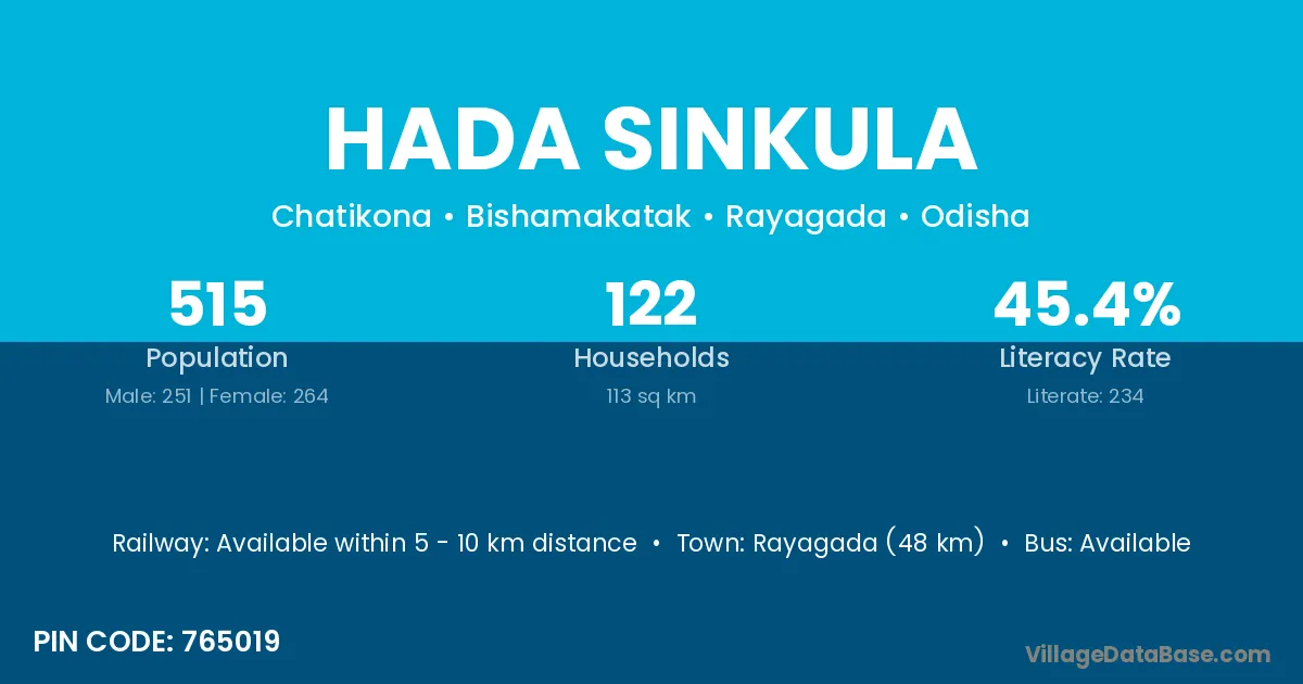 Rayagada (48 km) is the nearest town to Hada Sinkula village for major economic activities and is located approximately 48 km away.